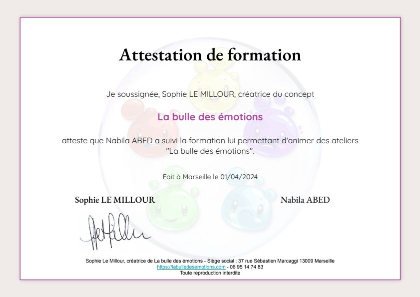 Spécialisation en ateliers franchisés "La bulle des émotions" exclusivité à Salon de Provence et Pélissanne.